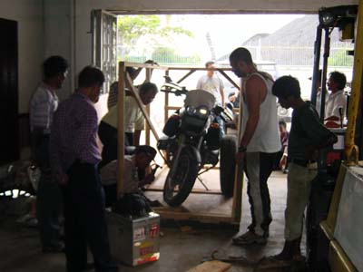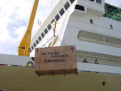 Let me back up a bit and tell you the logistics of getting my bike onboard. It all began with a phone call to the Padang (Sumatra) office of the government-run shipping line and enquiring whether it would be possible to ship my bike if I chose to travel on one of their �luxury liners�, I was told to come and see them in person when I got to Padang. Upon my arrival the head cook and bottle washer tells me that it is against all regulations to ship motorcycles or motorcars on his ship, but for me he�ll make a special exception. So far so good. I then enquire of the price and he assures me it is nothing to worry about, and I figure that since my 1st class ticket costs about USD 70 that shipping can't be costing me nearly as much! So off the lackeys go to buy wood and nails to build the crate that bossman is insisting on. About 2 hours go by, during this time work has commenced on the crate by the two most incompetent carpenters of all time. The first guy keeps losing his grip on his hammer causing panic whenever he raises it in case it goes flying towards to the crowd of onlookers and his assistant is forever screwing the handle back on his saw as it keeps falling in two, not exactly an advert for Black & Decker.
